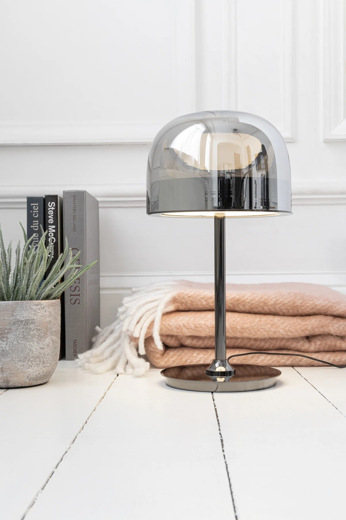 Descubra a elegância da “Topja” – um candeeiro de mesa que impressiona pelo seu brilho prateado. Fabricado em vidro de alta qualidade com detalhes metálicos, este candeeiro não só reflete a luz, como também um estilo sofisticado.