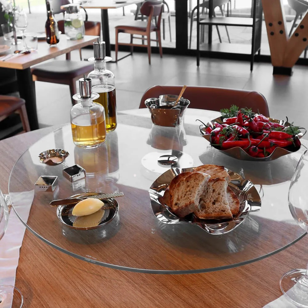 Os vidros Riva são exclusivos e seguem a mesma filosofia da matéria-prima base: a qualidade. O vidro do prato Palmi é italiano e carrega o selo Cristalino di Venezia, com melhor transparência e acabamento, além de não possuir chumbo em sua composição.