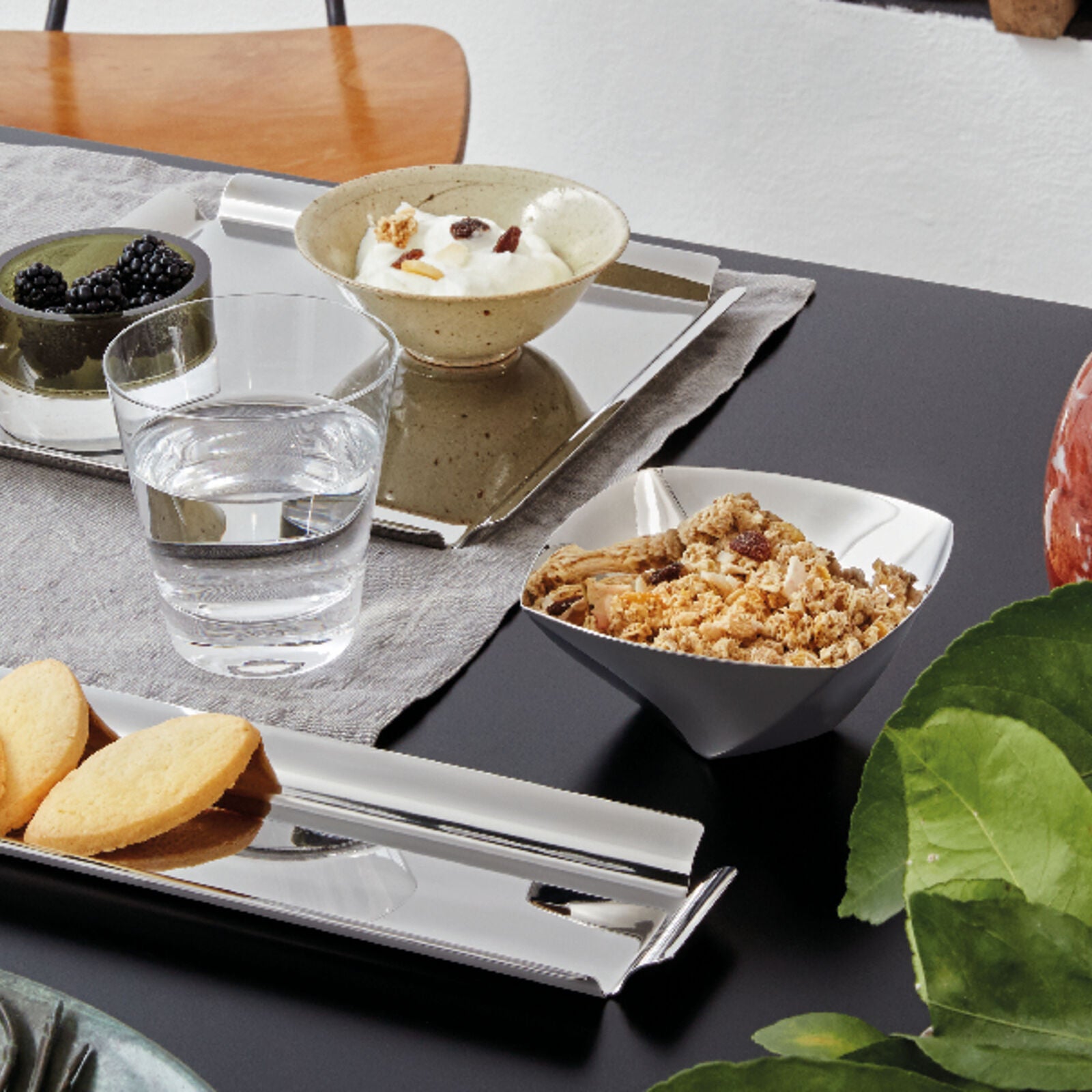 O acabamento com efeito espelhado realça a elevada qualidade do aço inoxidável, enfatizando as formas e o design. As superfícies são polidas com aditivos e escovas mecânicas de diferentes materiais, que suavizam o aço inoxidável, conferindo-lhe um elevado brilho. Os reflexos enriquecem o objeto, tornando-o ainda mais precioso.