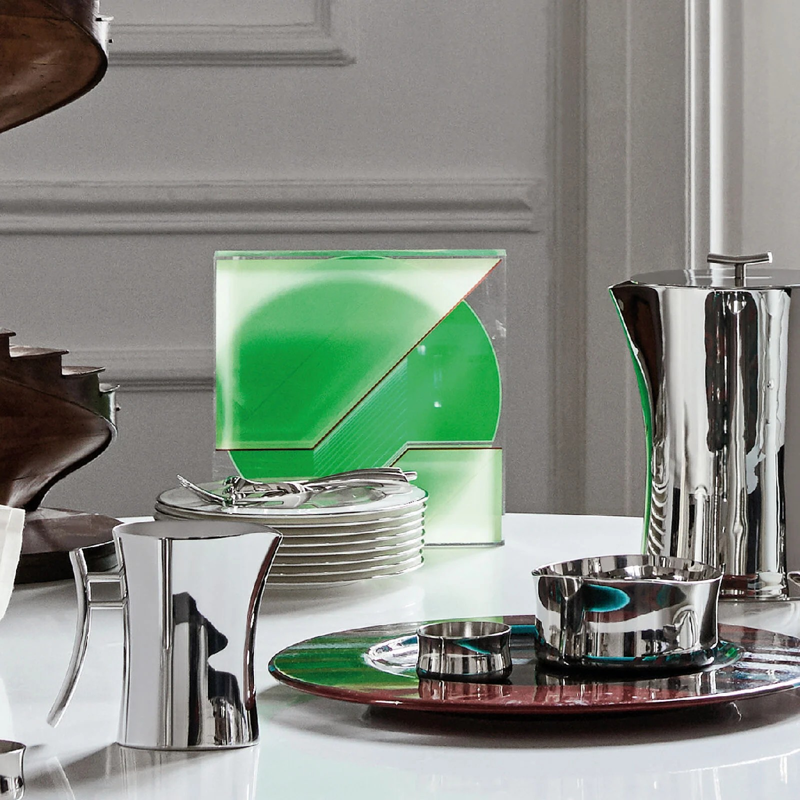 O acabamento espelhado realça a elevada qualidade do aço inoxidável, enfatizando as formas e o design. As superfícies são polidas com aditivos e escovas mecânicas de diferentes materiais, que suavizam o aço inoxidável, conferindo-lhe um elevado brilho. Os reflexos enriquecem o objeto, tornando-o ainda mais precioso.