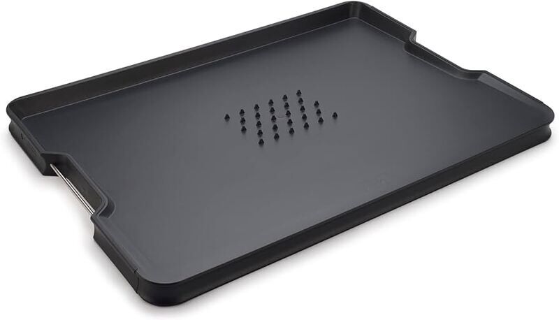 Um dos lados possui uma pega integrada para ajudar no corte da carne, enquanto o outro oferece uma superfície de corte lisa para todos os outros tipos de preparação de alimentos. Outros detalhes inteligentes incluem uma base angular, bordas elevadas e cantos fáceis de despejar para recolher e descartar migalhas e líquidos.