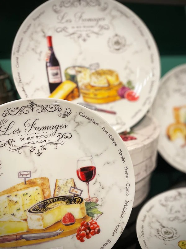 Conjunto de pratos com ilustrações diferentes que complementam as tábuas de cortar, os pratos giratórios e os guardanapos de papel da coleção «Les Fromages».