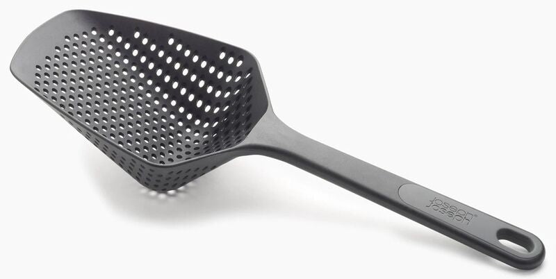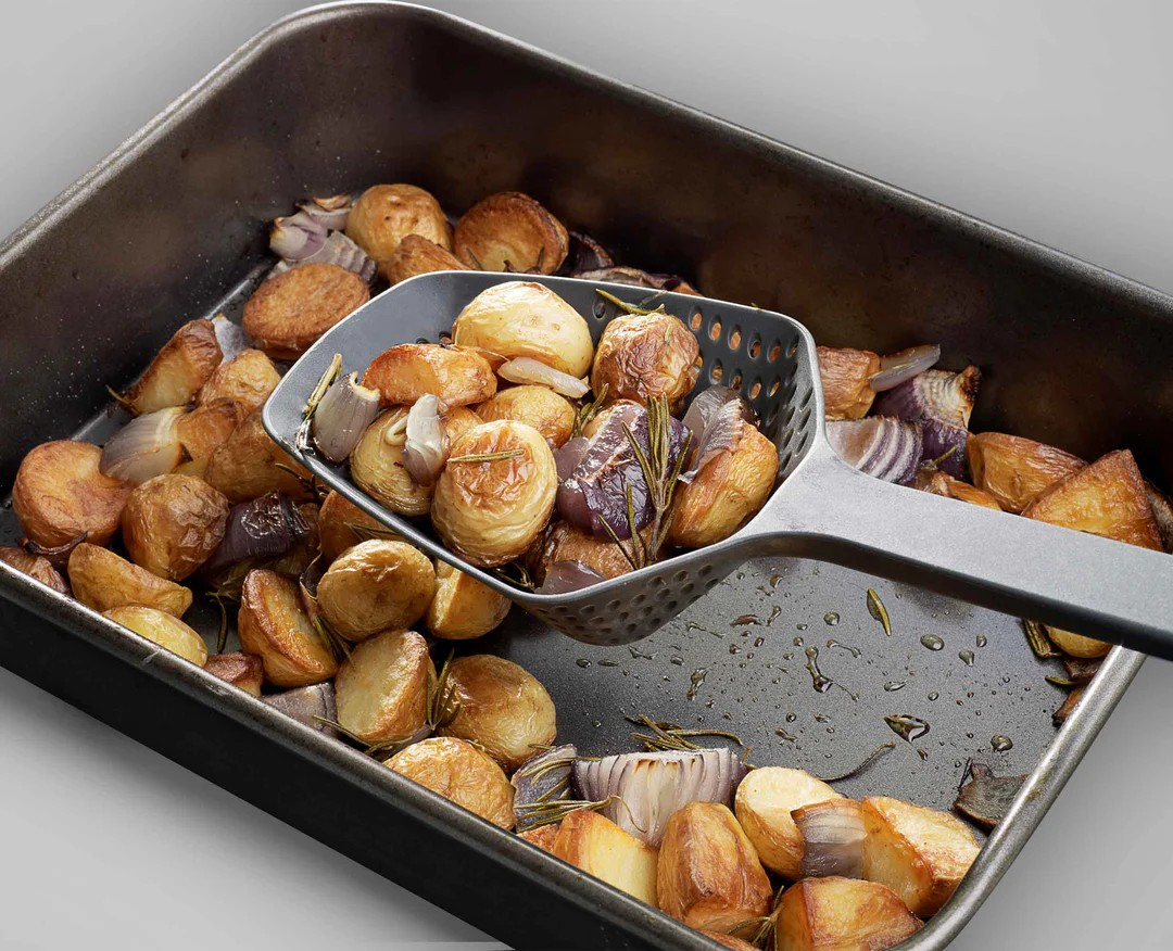 Este utensílio de cozinha simples permite-lhe retirar, escorrer e servir alimentos diretamente de uma frigideira ou tabuleiro quente.