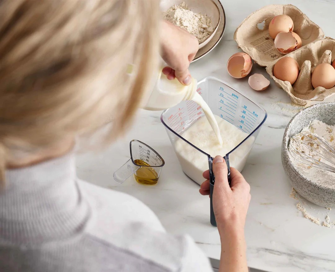 Não é necessário inclinar-se para ler este jarro medidor grande, pois ele tem um design angular com medidas claras, permitindo que você leia o volume por cima enquanto despeja.