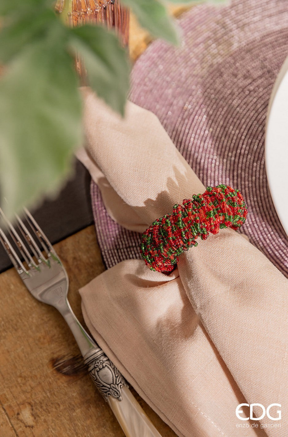 Porta guardanapos redondo com missangas verdes e vermelhas.