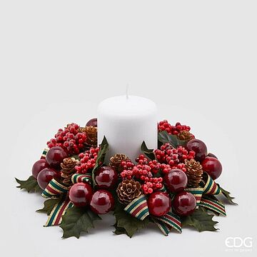 Coroa Agrifoglio com laços, folhas verdes e vagas vermelhas, para velas.