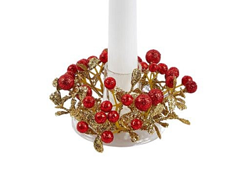 Coroa pequena com folhas douradas e bagas vermelhas para velas.
