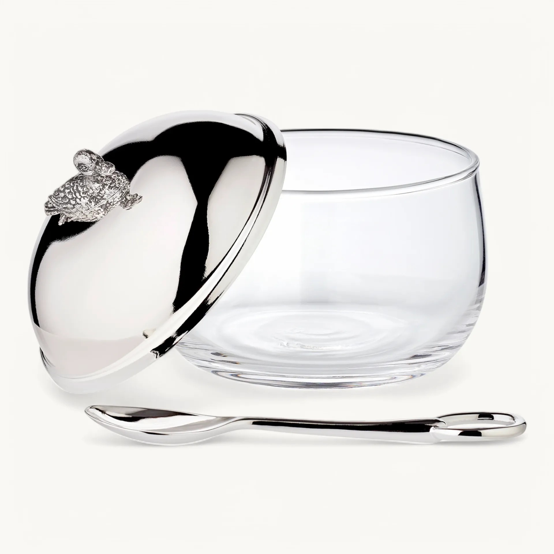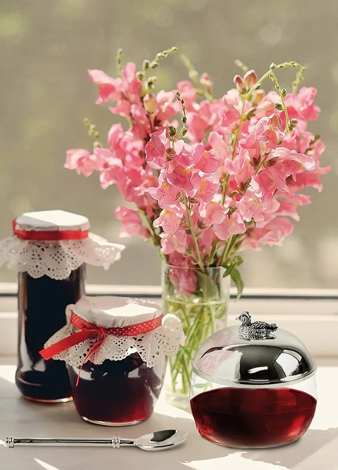 O pote de compotas da EDZARD faz brilhar todas as mesas de pequeno-almoço. O pote para a compota com um design simples é feito de vidro de cristal. Juntamente com uma tampa e a colher banhada a prata que o acompanha, o conjunto está completo.