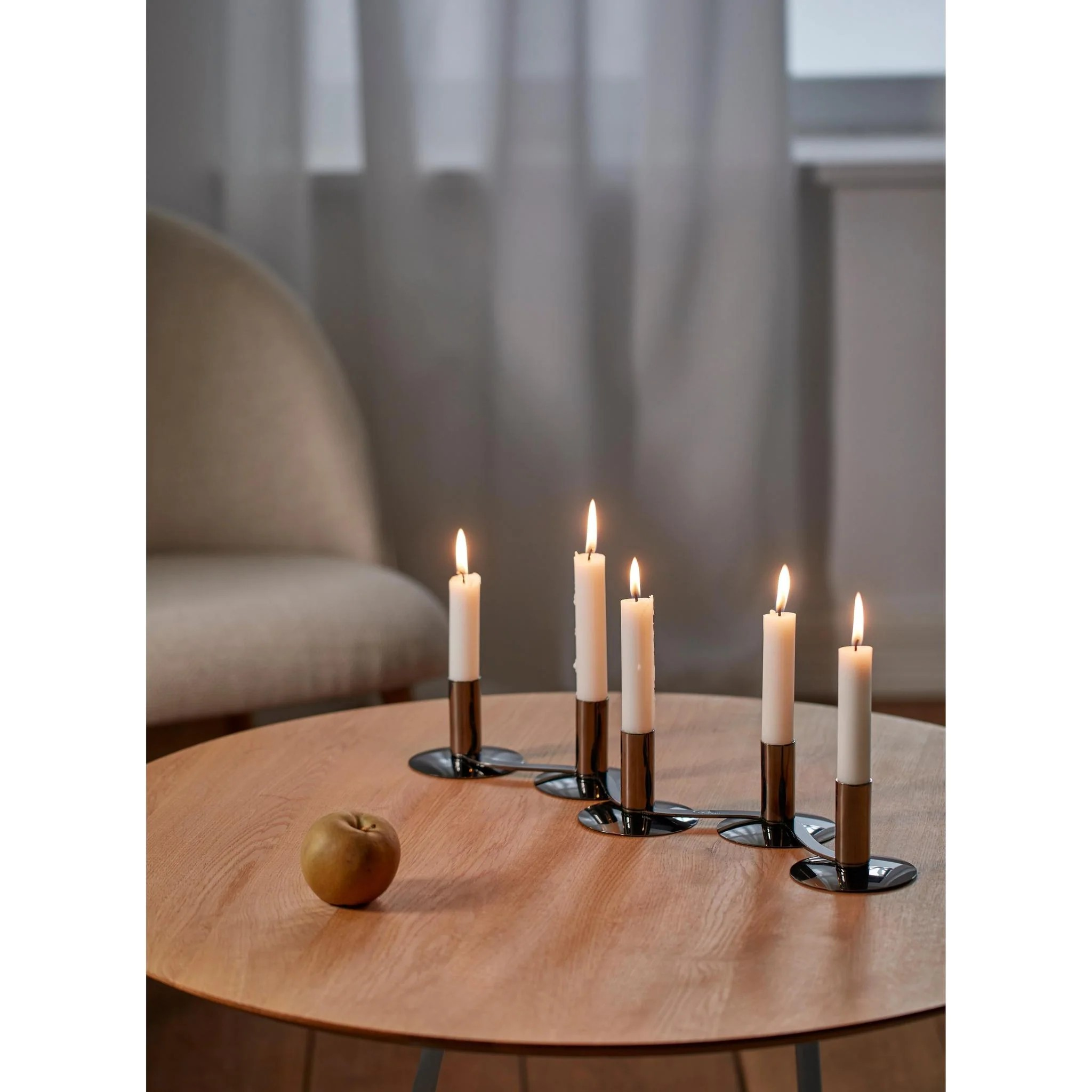 O lustre em ziguezague, feito de aço inoxidável com revestimento de titânio escuro, tem ambições exclusivamente harmoniosas. O design inovador, que pode ser facilmente rodado para acomodar tanto velas em bastão como velas quadradas, é um convidado bem-vindo em qualquer mesa festiva ou simplesmente um destaque na janela.